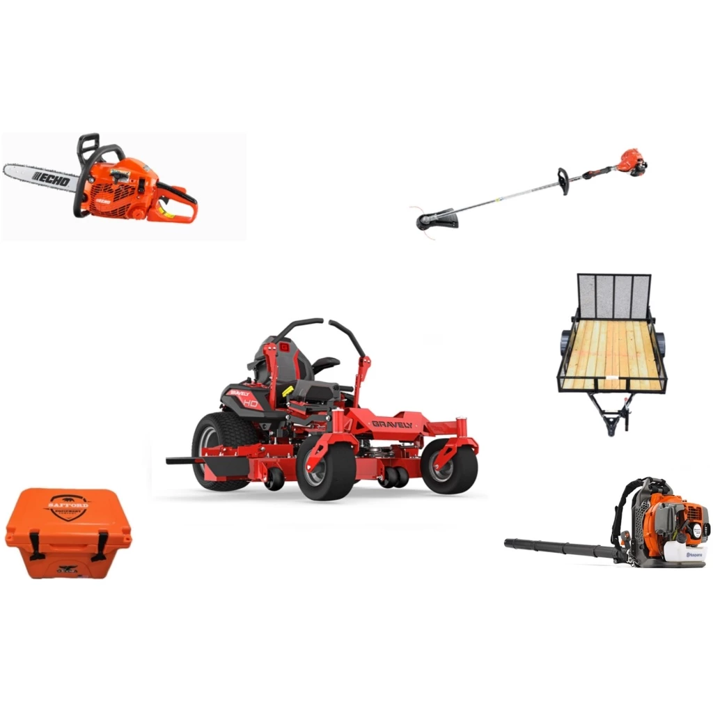 The GE4117 Gravely Mower Bundle provides great power in the shape of a Gravely ZT HD 52 Zero Turn Mower, a trimmer and chainsaw by ECHO, and a Husqvarna made blower to help get your yard in shape all year round.