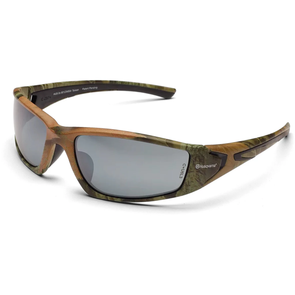 Enter the woodlands in Husqvarna Style. These sunglasses feature a sleek and modern full-frame design for added protection. Dual mold rubber temple grips for better stability. Camo frame color. Smoke lens color. 99.9% UV Protection. Meets ANSI Standard Z87.1.